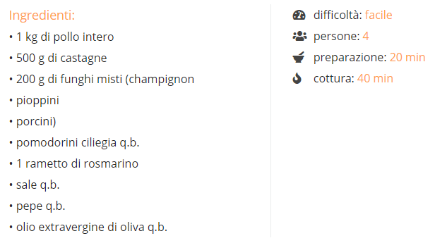 - Pulite i funghi con un canovaccio pulito, eliminate gli eventuali residui di terra e tagliateli a tocchetti. Unite i funghi al pollo e alle castagne e da ultimo aggiungete anche i pomodorini. Insaporite con sale, pepe e rosmarino tritato.