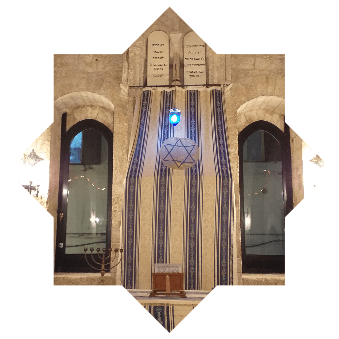 La piccola Sinagoga, una delle quattro , di cui due andate distrutte nel 1700, che rendevano fiorente la comunità di Trani, è con buona probabilità la più antica d’Europa. Fu edificata nel XIII secolo, interamente in pietra calcarea e presenta una facciata con quattro monofore ad arco e portale unico. A completare il piccolo gioiello architettonico un campanile a vela, sormontato da una Stella di David in ferro battuto che domina l’intero edificio. L’accesso si guadagna grazie a una scalinata posta sul lato occidentale, protetta da un piccolo cancello intarsiato col Maghen David .