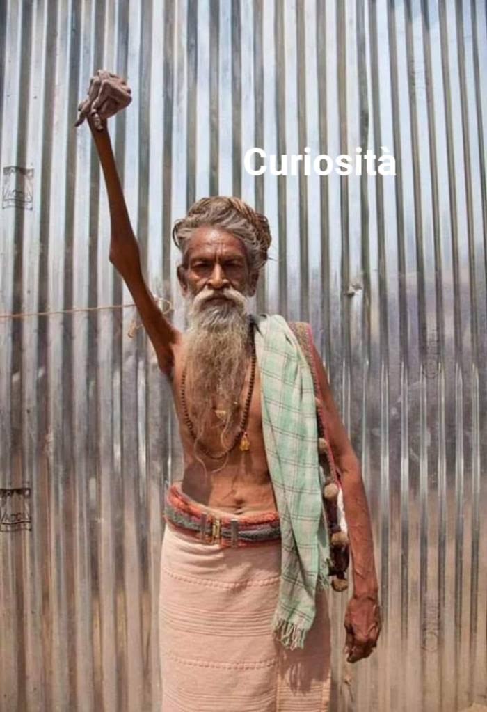 (L’uomo nell’immagine é un hindu ad aver tenuto alzato il braccio per 45 anni, in totale putrefazione senza essersi ma tagliato le unghia, in onore di Shiva.)