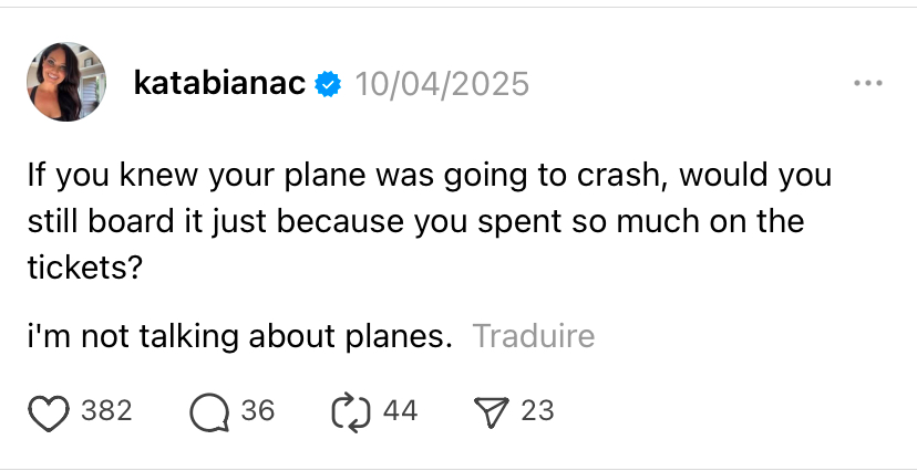 Se sapessi che il tuo aereo precipiterà, ci saliresti lo stesso perché “il biglietto ti é costato così tanto” ? Non stò parlando di aerei.